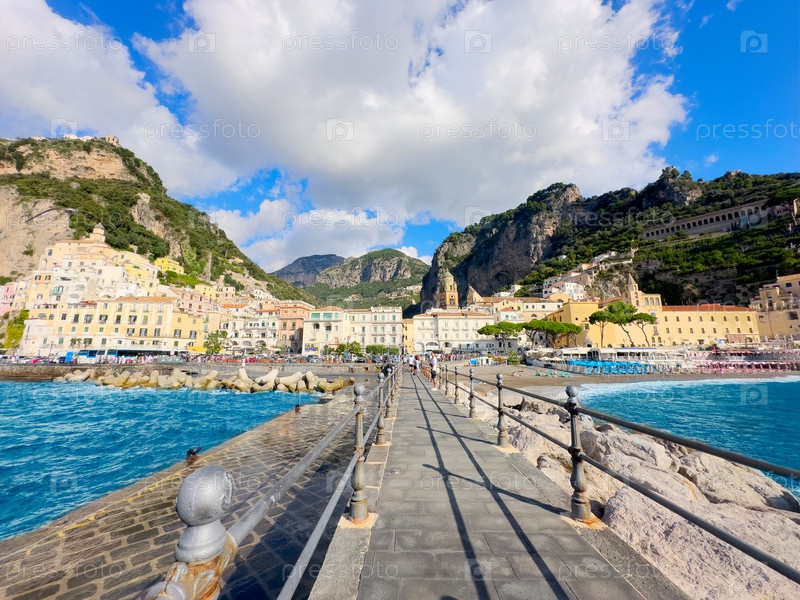 Набережная Амальфи и летнее побережье и Тирренское море со старым городом Атрани, Италия