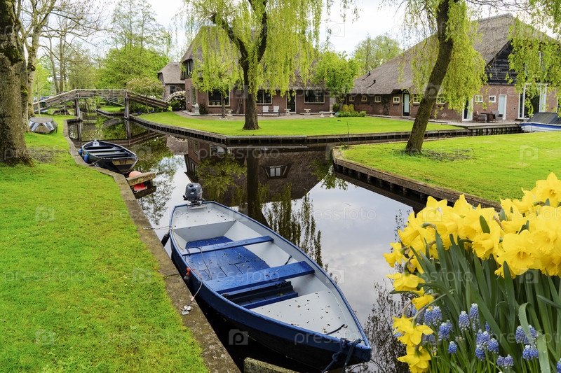 Голландская деревня традиционная страна небольшой город Гийтхорн с каналами, Нидерланды весной