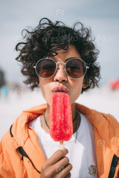 Стильная молодая женщина наслаждается разноцветным мороженым, наслаждаясь прекрасным солнечным днем на пляже