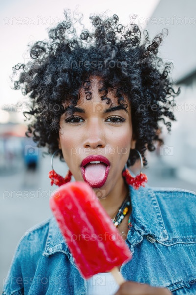 Стильная молодая женщина наслаждается розовым замороженным льдом, одновременно наслаждаясь прекрасным солнечным днем на пляже