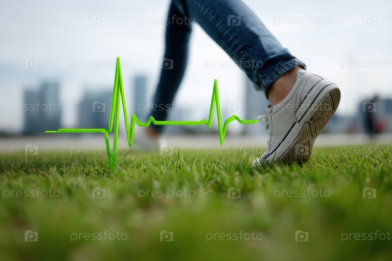 Женщина в оранжевом наряде элегантно прогуливается по живописному поле с графиком сердечных сокращений, наложенным на сцену