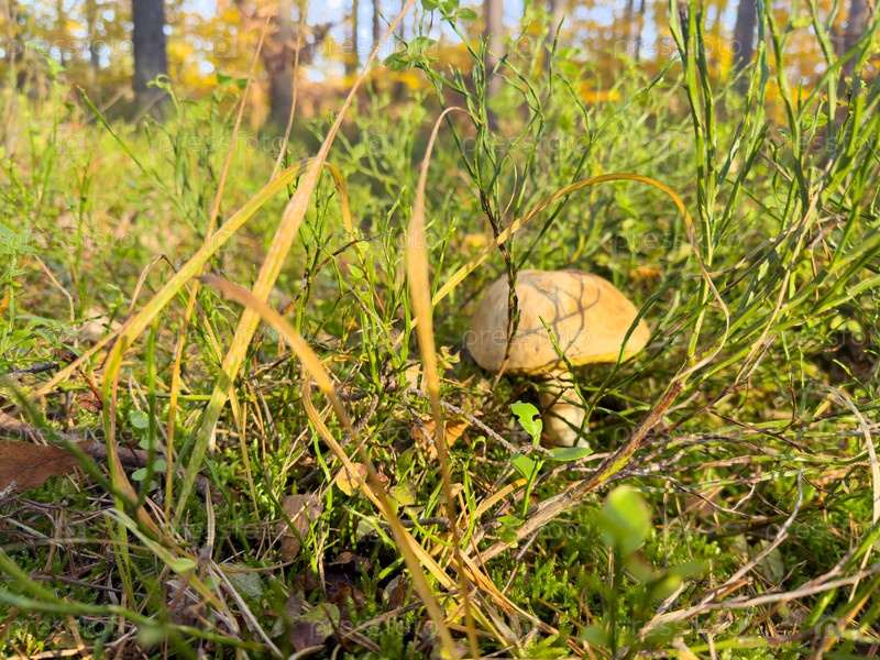 Ярко-желтый гриб посреди пышного зеленого леса, изобилующего жизнью