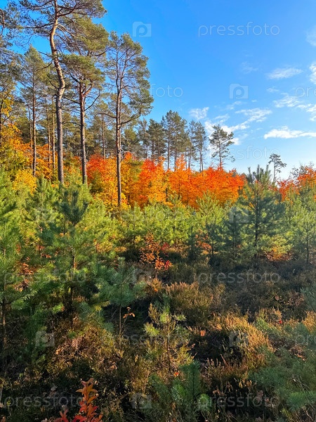 Потрясающие цвета осени освещают лес, все под ярким и чистым голубым небом над головой
