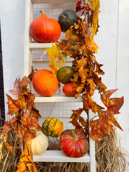 Очаровательный осенний декор с красочными тыквами и праздничными листьями у вашего уютного и приглашающего входа
