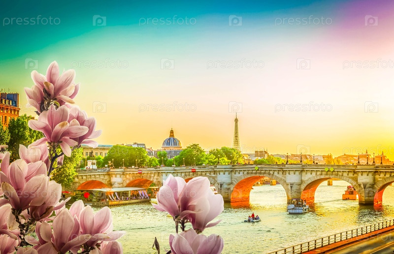 Мост Понт-Нёф и река Сеня при солнечном весеннем закате, Париж, Франция, в ретро тонах