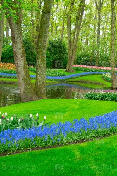 Красочная весна с чистой водой в саду тюльпанов, показывающая яркие цветы в пышной обстановке, приглашает посетителей исследовать