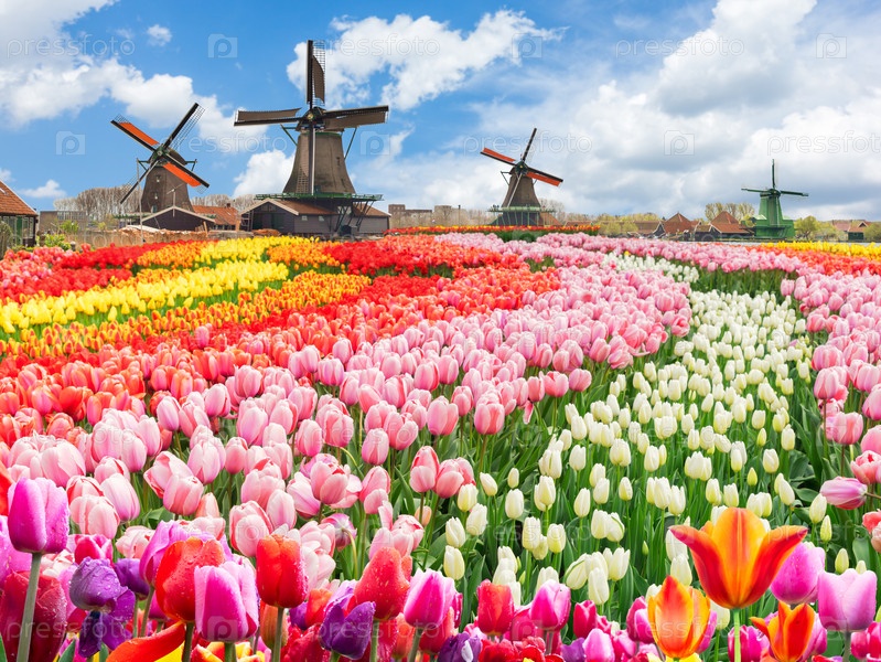Голландские ветряные мельницы над полем цветов тюльпанов в солнечный день, Нидерланды