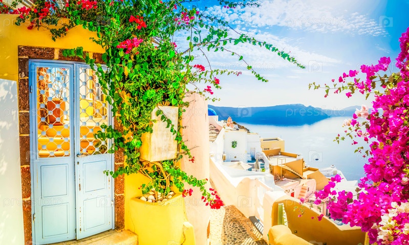 Традиционная греческая деревня Оя Санторини, красивая улица на море Эган и кальдера, Греция, формат веб-баннера