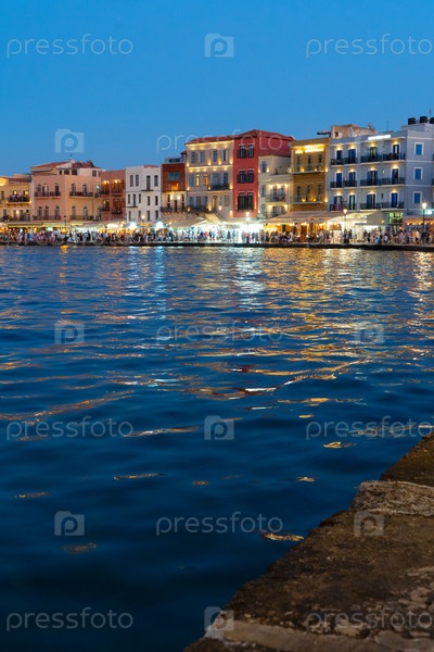 Хания Венецианская гавань с морем Эган, освещенным ночью, Крит, Греция