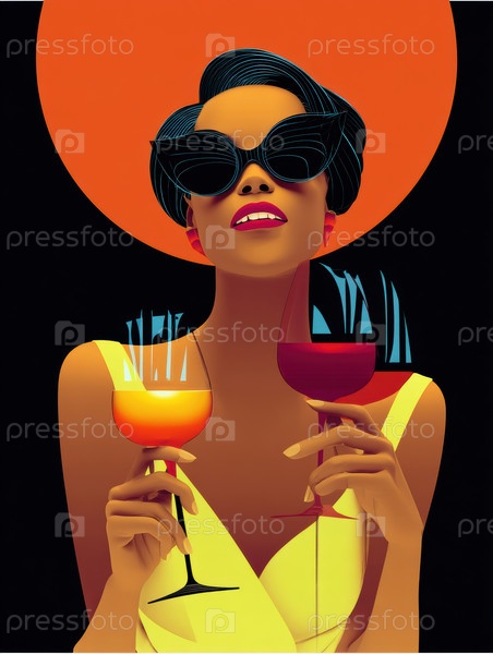 Стильная женщина счастливо наслаждается освежающими напитками в модных солнцезащитных очках среди смелого заката
