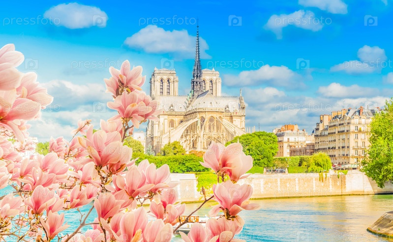 Соборная церковь Нотр-Дам над рекой Сена в весенний день с цветами магнолии, Париж, Франция