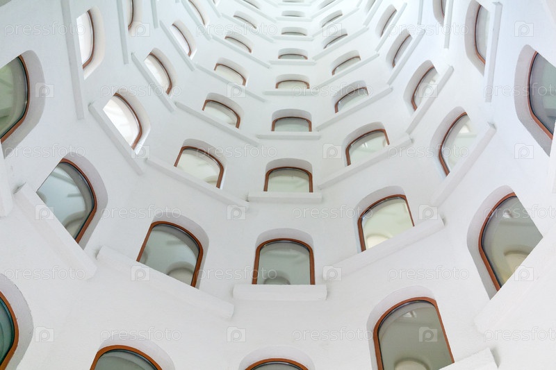 Архитектурный фон, спиральная лестница с окнами, открывающимися в световой колодец