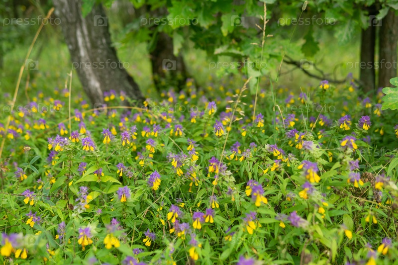 Красивые желтые и фиолетовые дикие цветы в лесу летом
