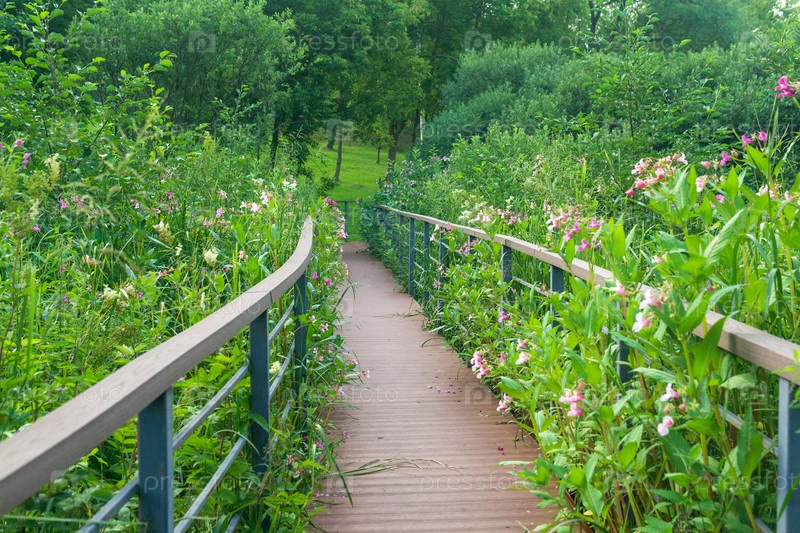 Набережная в водно-болотных угодьях летом, образовательная тропа