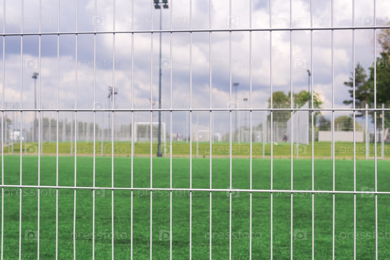 Спортивные площадки и футбольное поле с зеленой травой и сетками.Горизонтальный выстрел