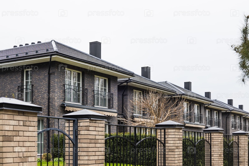 Гладкие таунхаусы из темного кирпича с соответствующими дымоходами, кирпичными столбами и железным забором в тихой загородной усадьбе