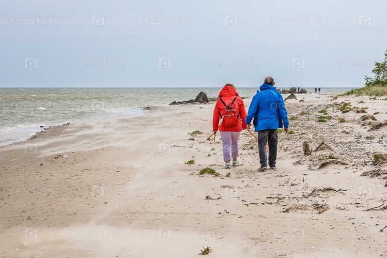 Сзади взгляд на пожилую пару в ярких куртках, держащихся за руки на пустынном берегу Балтии