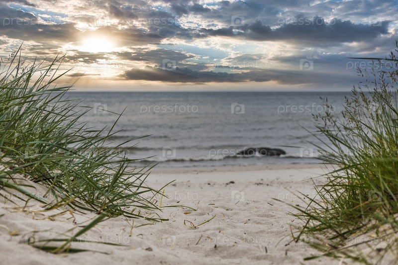 Приморское побережье Балтийского моря на рассвете с мягкими волнами, песчаными дюнами и травой маррам, вызывая спокойное настроение отдыха на море