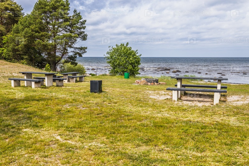 Пустые приморские пикники на побережье Балтии с скамейками, кострами, травой и волнами под драматическим небом