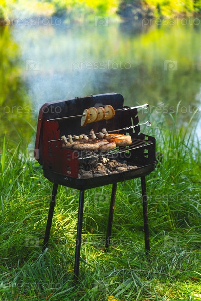 Мобильный барбекю на берегу лесной реки