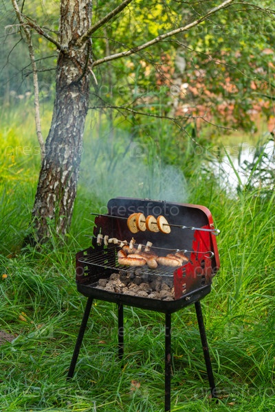 Мобильный барбекю на берегу лесной реки. колбасы, бекон и жареный хлеб с щипцами. семейный пикник