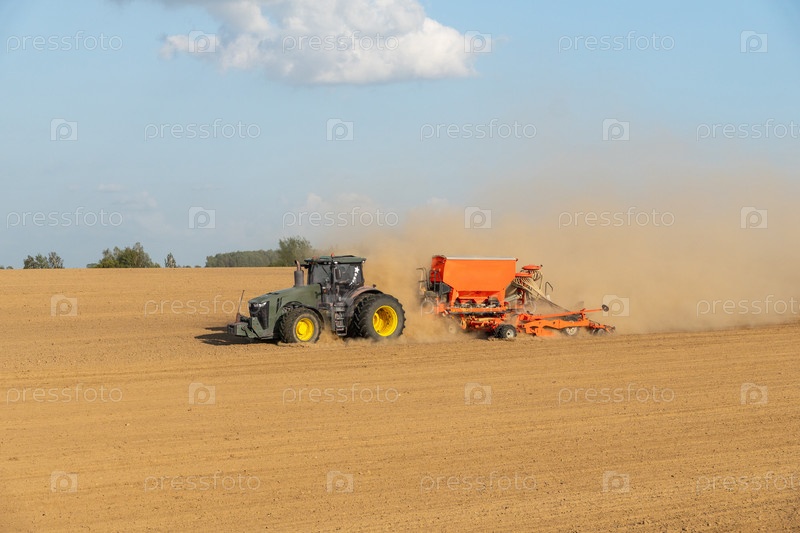 Трактор, буксирующий сеяльщик, создает облака пыли при выполнении полевых работ под голубым небом с белыми облаками
