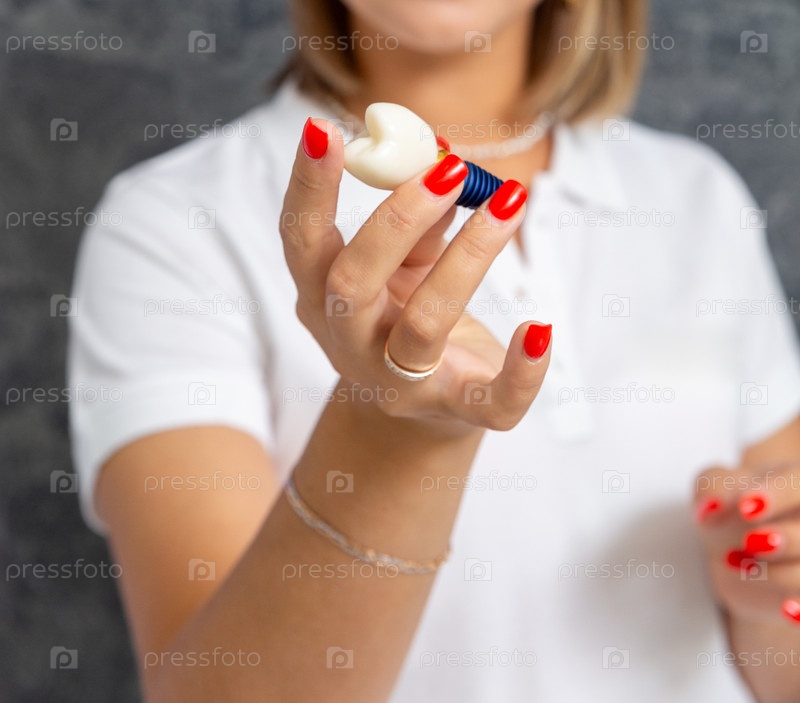 Непризнанная стоматолог-женщина в белой футболке и красном маникюре держит модель зубного имплантата