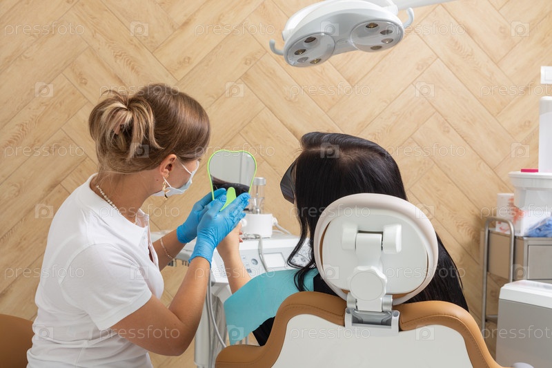 Женщина-стоматолог в современной клинике показывает пациенту результаты лечения, используя зеркало, обеспечивая ясное понимание и удовлетворение