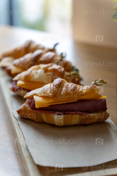 Свежевыпеченные круасанты из ветчины и сыра, расположенные на деревянной доске