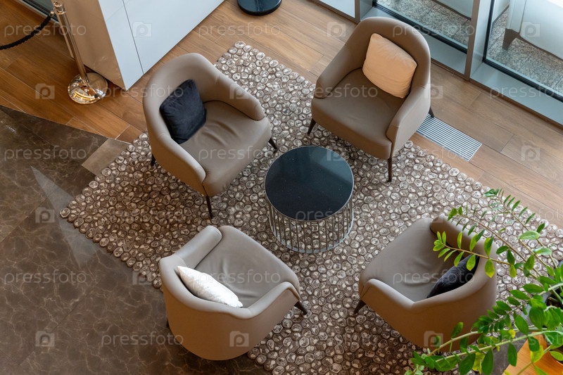 Современное гостиничное лобби с четырьмя плюшевыми стульями и столом для встреч, снятое в минималистском стиле с видом снизу на мягкий ковер