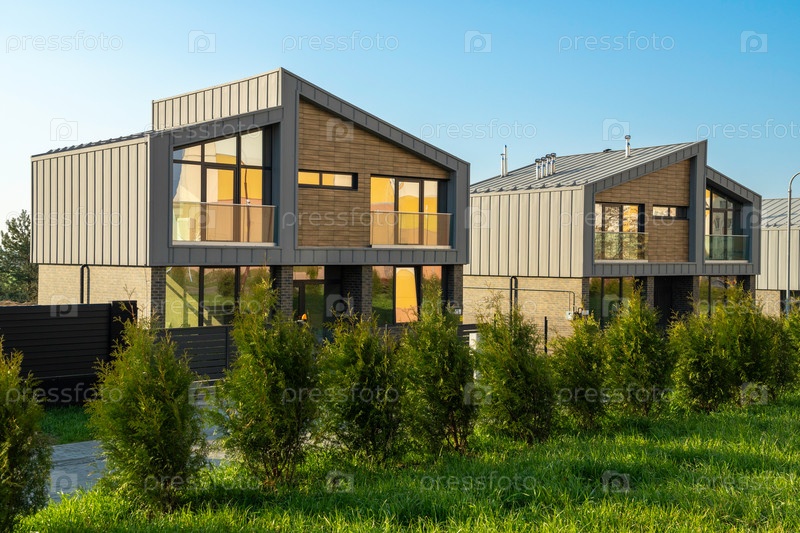 Современный таунхаус с частным садом, пышной зеленой лужайкой и ухоженными туи-деревьями в тихом жилом районе