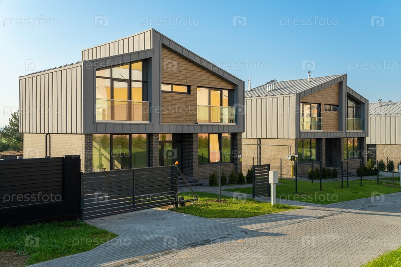 Современный таунхаус с частным садом, пышной зеленой лужайкой и ухоженными туи-деревьями в тихом жилом районе