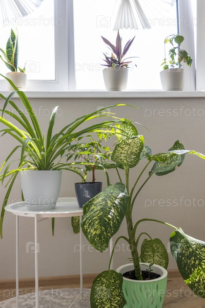 Уютный балкон, украшенный в светлых цветах комнатными растениями