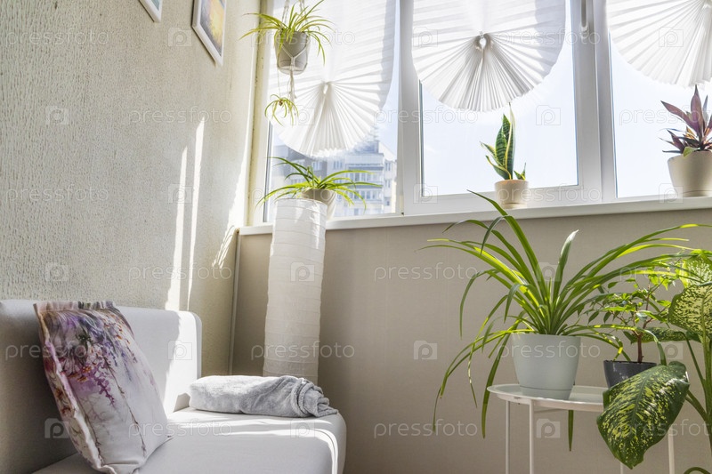 Уютный балкон, украшенный в светлых цветах комнатными растениями