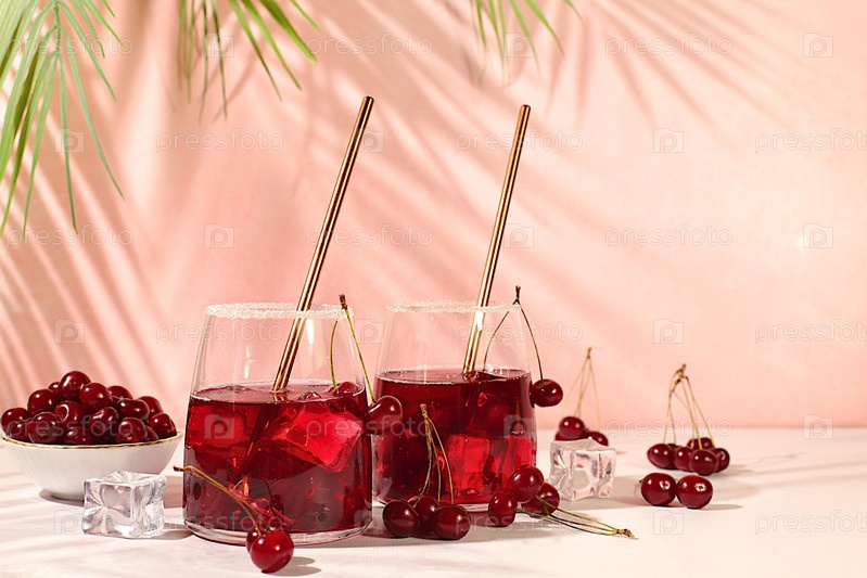 Освежающий домашний лимонадный коктейль, мохито с вишней, мятой, льдом и лимоном, концепция похудения, детоксикационная вода фруктового вкуса. Здоровая и натуральная еда, реклама в барах и кафе, осенний баннер