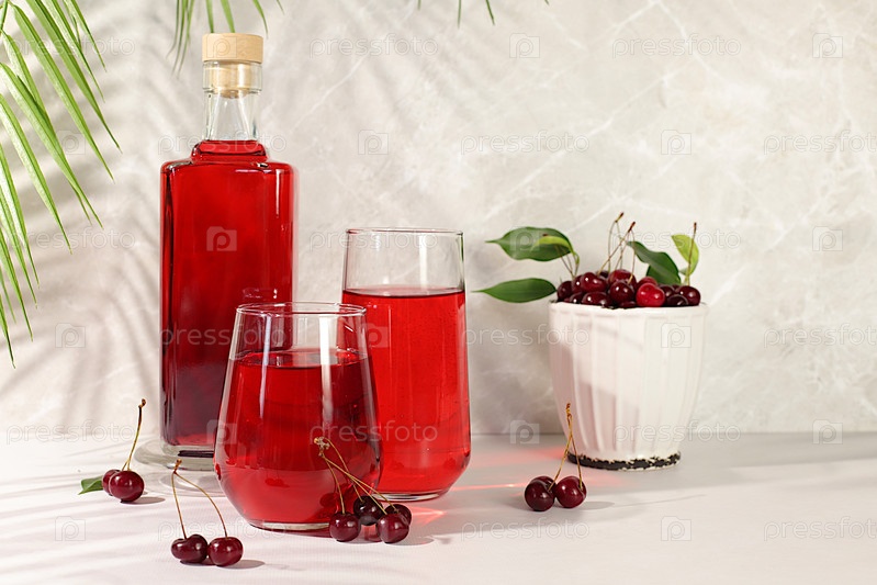 Домашний сильный вишневый сидр в бутылках и бокалах на элегантном фоне, натюрморты с алкогольными напитками и свежими вишнями, концепция домашнего виноделия, минималистический баннер для бара,
