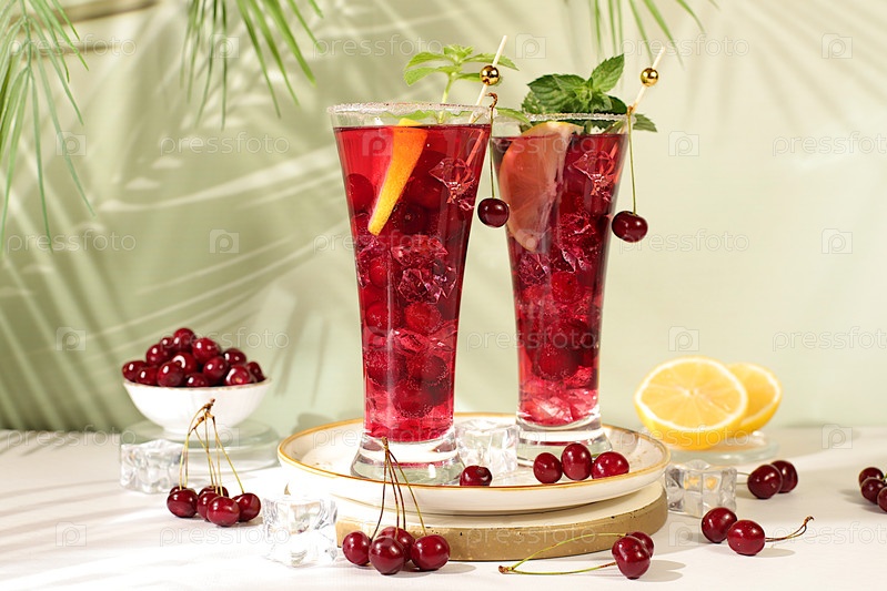 Сангрия или коктейль с мятой, вишней, газировкой, лимоном и льдом, меню ресторана и бара, освежающий рецепт летних и осенних напитков, детоксикационная диета и концепция похудения, холодная домашняя лимонада
