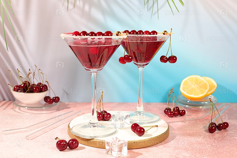 Маргарита с вишней, мятой, лед с текилой, водка на элегантном фоне, натюрморт со напитками минималистическая концепция для бара, безалкогольный и алкогольный напиток для похудения, рекламный баннер для кафе