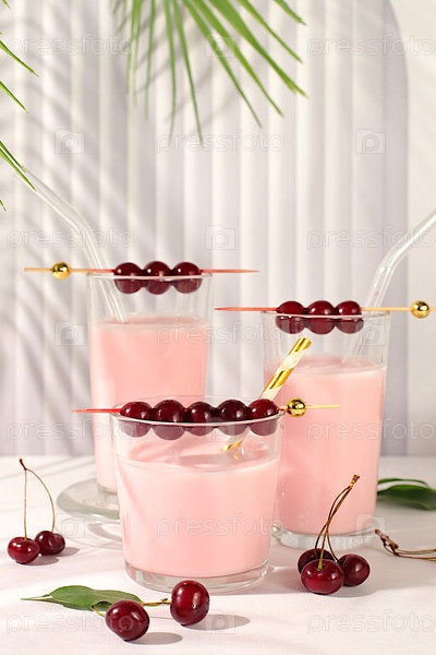 Вишневый коктейль со стаканами с свежим сливком и свежими вишенками на элегантном столе, детоксикационная диета и естественное понятие питания, здоровый завтрак с ингредиентами. Реклама здорового образа жизни, детский корм