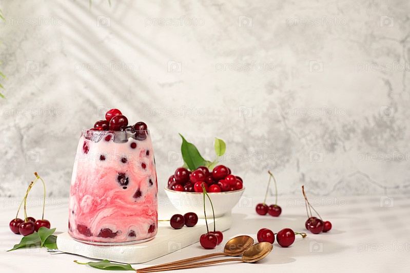 Современный натюрморт с ягодами и напитками. вишневый йогурт с ягодами в стакане на элегантном столе, фруктовый салат, детоксикационная диета и натуральная концепция питания, здоровый завтрак с ингредиентами