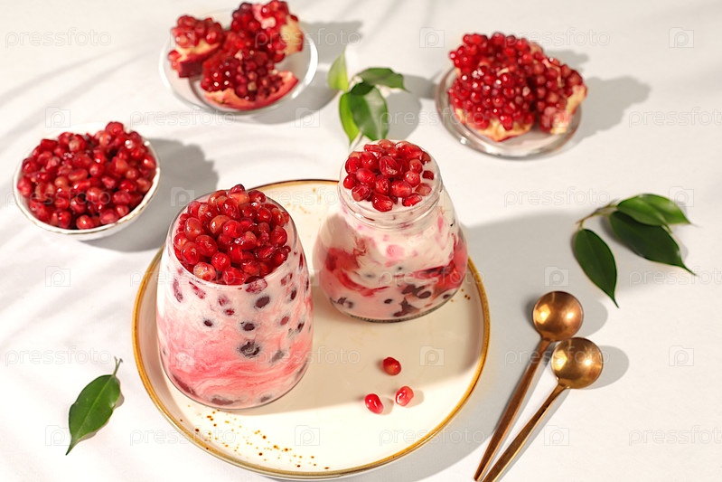 Фруктовый йогурт с семенами граната и свежим коровьим сливком для здорового питания в стакане на элегантном столе.Здоровый завтрак с ингредиентами, кухонный фон