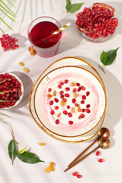 Здоровый завтрак с ингредиентами. гранатный йогурт с ягодами, изюмом и соком на солнечном столе, фруктовый салат, диета для детоксикации и концепция натурального питания, реклама здорового образа жизни