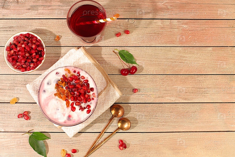 Гранатный йогурт с кусками граната, изюминки свежий крем для здорового питания и натуральный сок. Здоровый завтрак с ингредиентами, фон кухни, естественное питание и концепция диеты