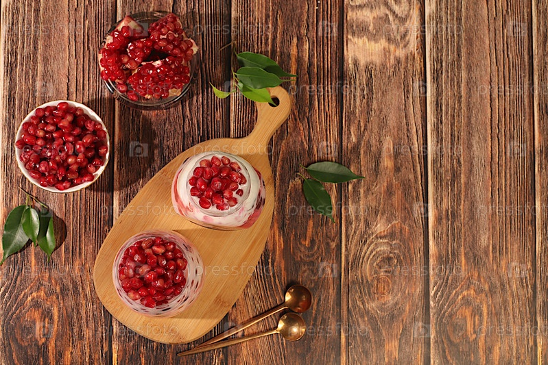 Фруктовый йогурт с гранатом, изюмом и свежим коровьим сливком для здорового питания. Здоровый завтрак с ингредиентами, кухонный фон. Естественное питание и концепция детоксикации, меню кафе