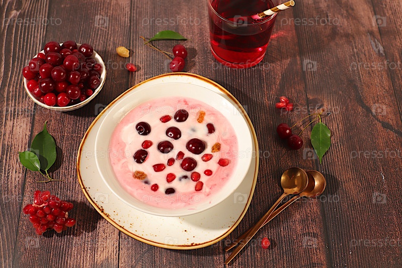 Здоровый завтрак с ингредиентами. вишневый йогурт с гранатовым яблоком, вишней, изюмом и соком на деревянном столе, фруктовый салат, диета для детоксикации и концепция натурального питания, реклама здорового образа жизни,