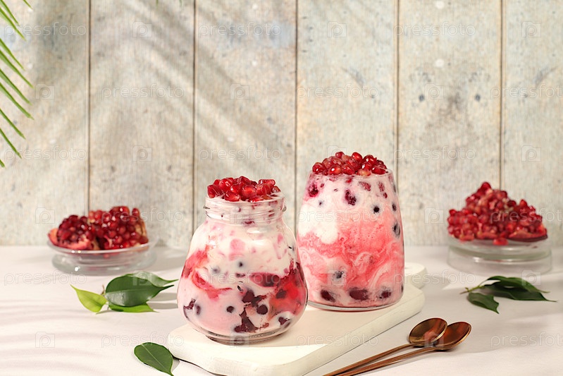 Современный натюрморт с ягодами и напитками. йогурт из граната с ягодами в стакане на элегантном столе, детоксикационная диета и концепция естественного питания, здоровый завтрак с ингредиентами, меню для кафе