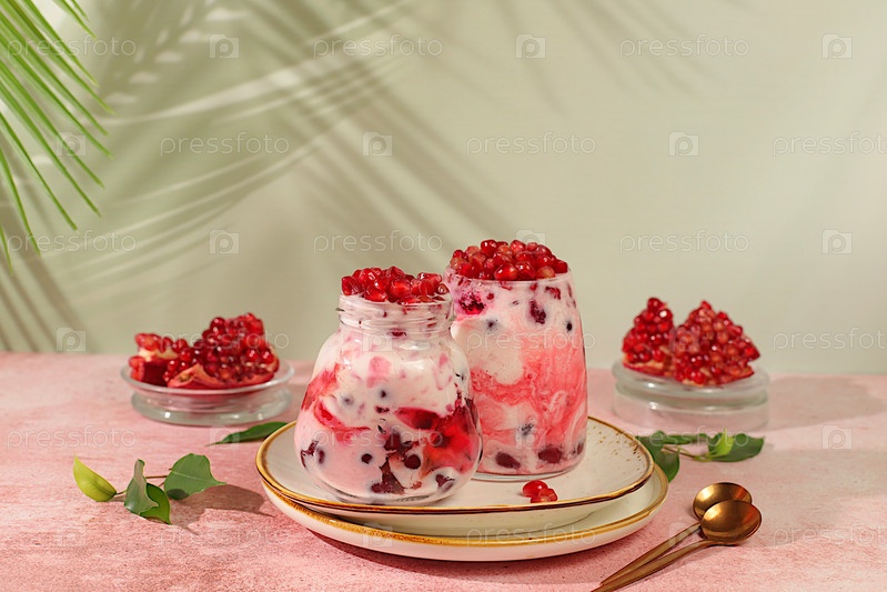 Современный натюрморт с ягодами и напитками. йогурт из граната с ягодами в стакане на элегантном столе, детоксикационная диета и концепция естественного питания, здоровый завтрак с ингредиентами, меню для кафе