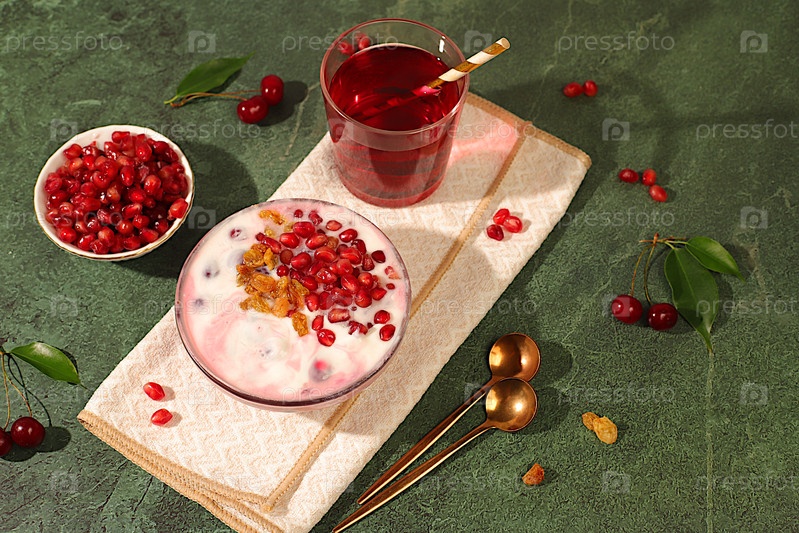 Гранатный йогурт с кусками граната, изюминки свежий крем для здорового питания и натуральный сок. Здоровый завтрак с ингредиентами, фон кухни, естественное питание и концепция диеты