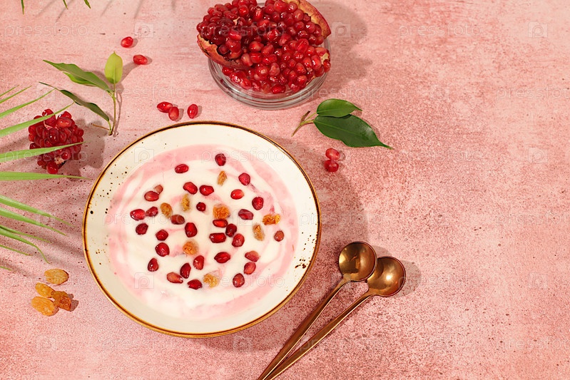Гранатный йогурт с кусками граната, изюминки свежий крем для здорового питания и натуральный сок. Здоровый завтрак с ингредиентами, фон кухни, естественное питание и концепция диеты