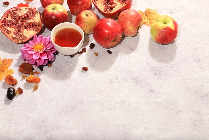 Творческая композиция на еврейский праздник Рох Хашан с местом для поздравлений. стилирование традиционными символами Еврейского Нового года, шаблон с медом, яблоками, гранатом и цветами